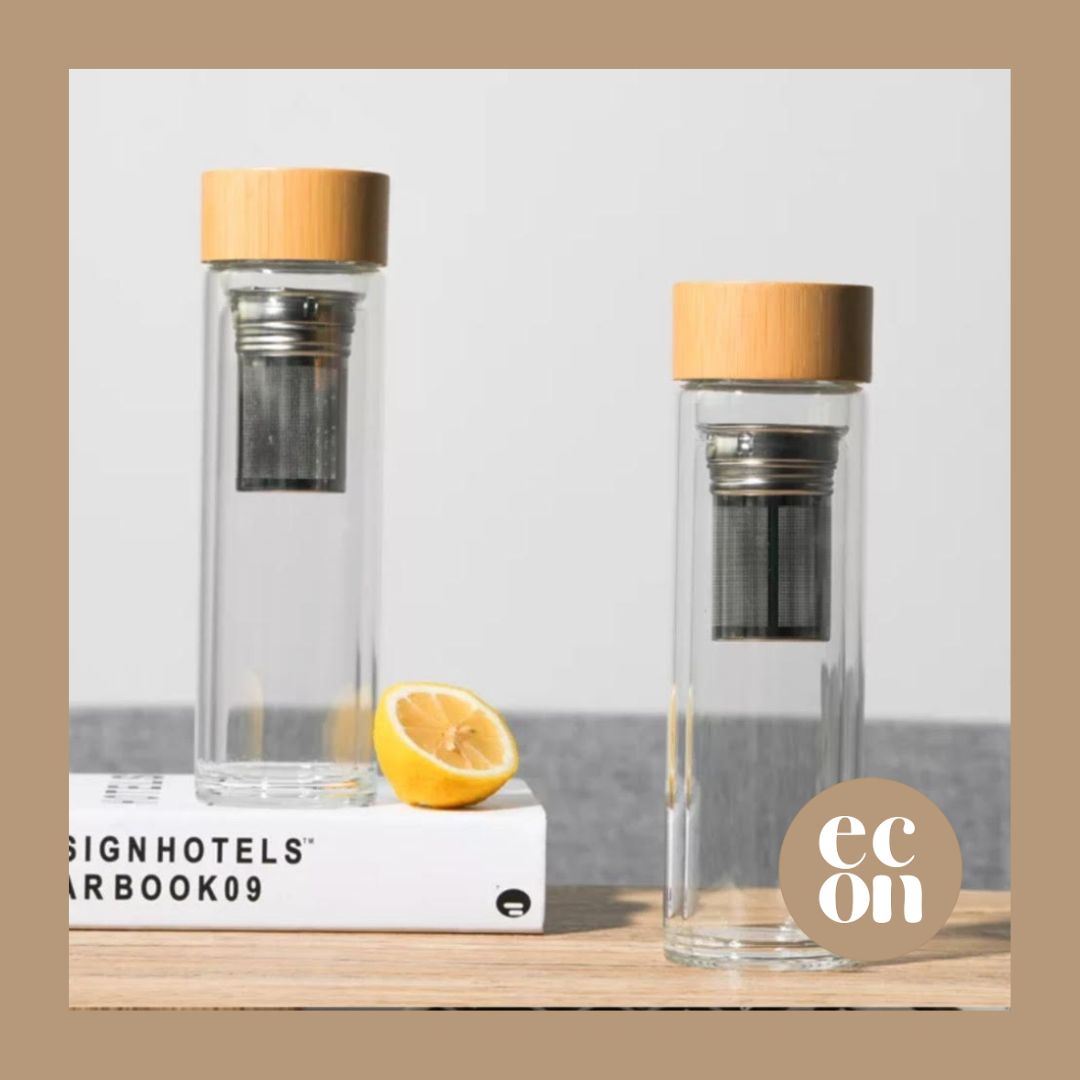 ♥ בקבוק זכוכית לחליטה - בקבוק שתיה של Econawa בעל דופן כפולה לשמירה על חום או קור של המשקה. מגיע עם מסננת מפלדת אל חלד ומכסה במבוק. BPA free.