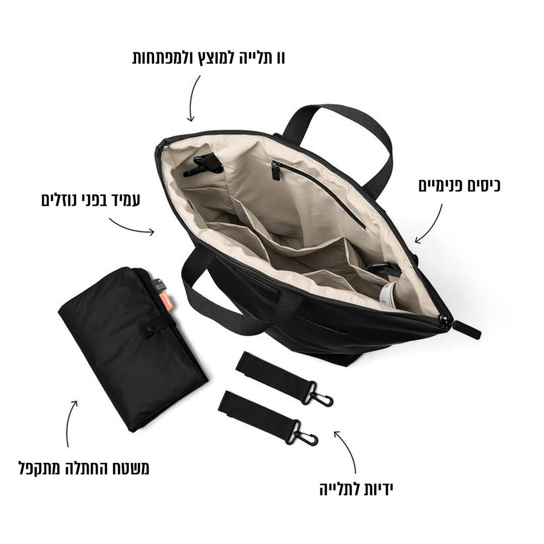 התיק כולל משטח החלפה עמיד למים ושני ווים לתלייה על העגלה